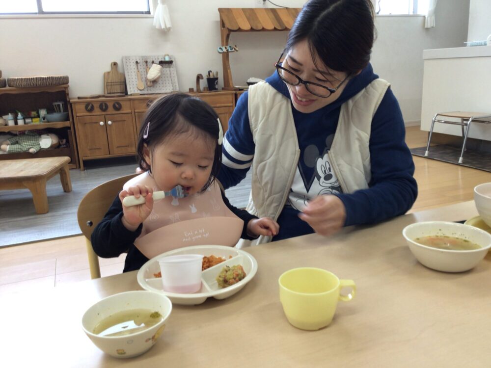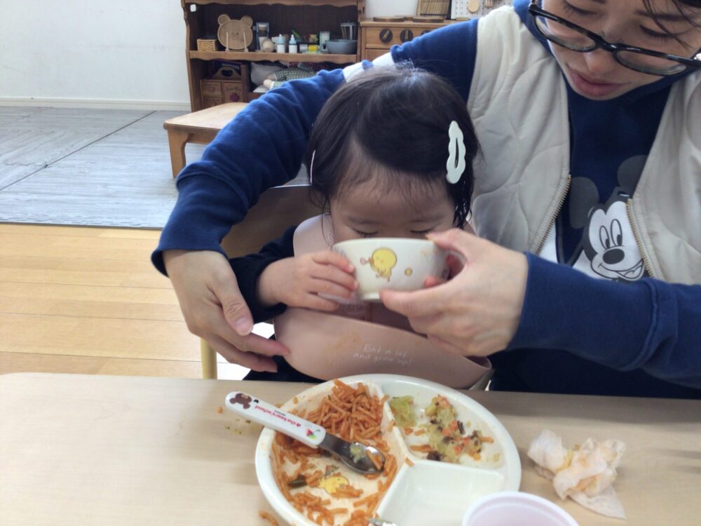 スプーンを持って、スパゲッティーを一生懸命食べるお友達。スープのお椀やコップも上手に持って飲んでいました。保育者の声掛けに「はい」と答えたり、「ごちそうさまでした」と手を合わせ可愛い姿を見せてくれました。