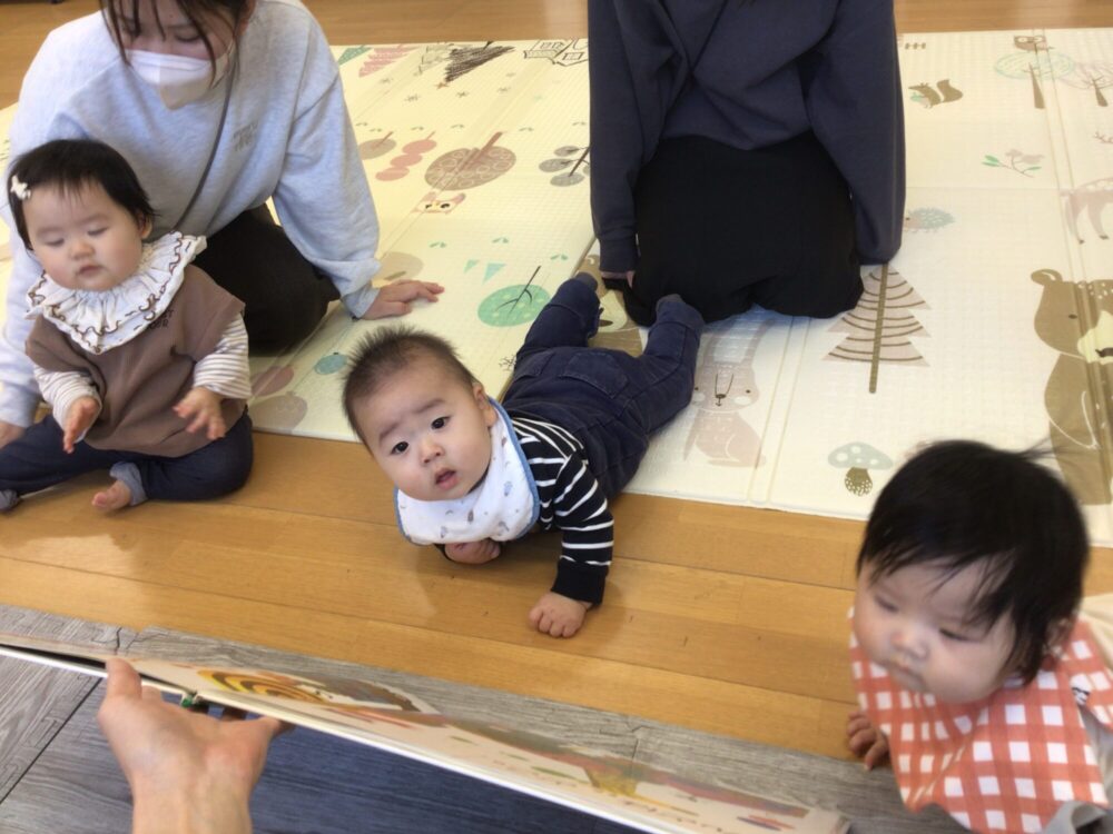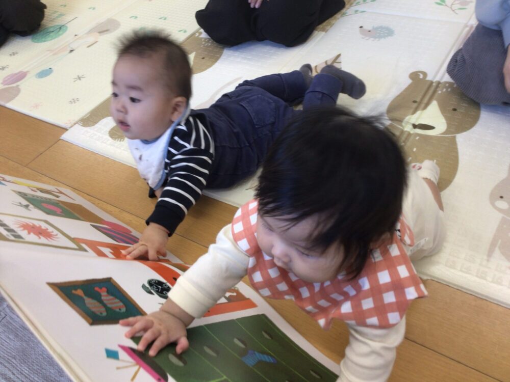 今月は色々な動物の尻尾が出てくるペープサートを見たり、『きんぎょがにげた』の大型絵本を見ました。目の前の大型絵本に興味を示して近寄ってくるお友達。金魚の他にも見つけた物を捕まえようと一生懸命手を伸ばしていましたよ。