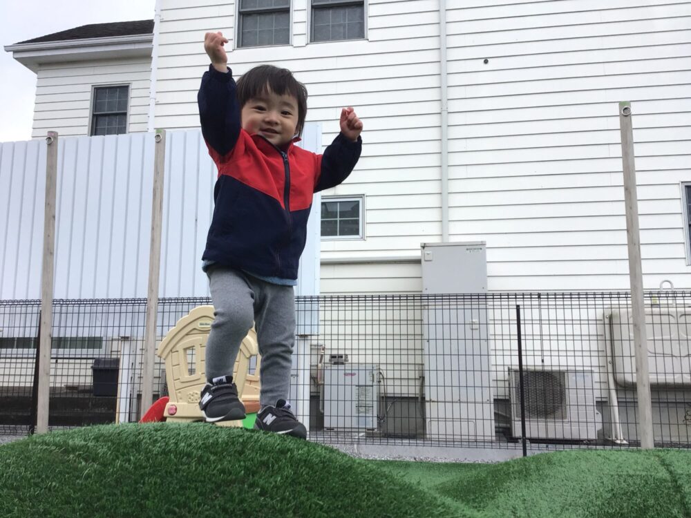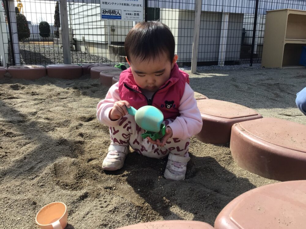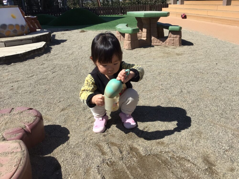 日中の気温も温かくなってきて、戸外遊びをする親子が増えてきました。大型遊具に登ってステンドグラスを覗いてみたり、砂場ではシャベルで集めた砂をもう片方のカップやコップに上手に移して遊んでいました。築山に登って嬉しそうにポーズをするお友達もいました。