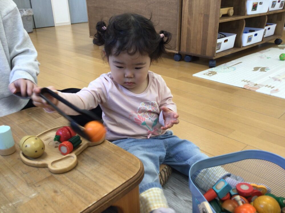 食材が沢山入っているカゴからトングを使って一生懸命掴もうとしていたお友達。上手く出来ず苦戦していましたが、コツをつかむとすんなり掴んでいました。遊んでいる写真を撮ろうと構えると、それを察したお友達がニコニコで近寄ってきてくれたりカメラ目線をしたり、色々な表情を見せてくれました。