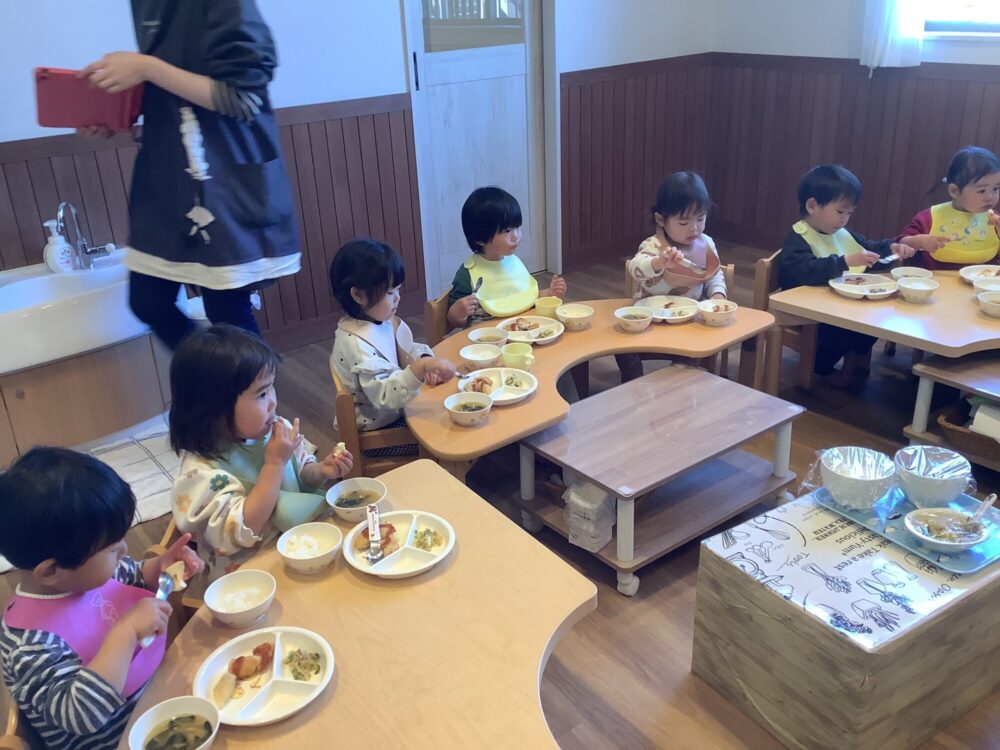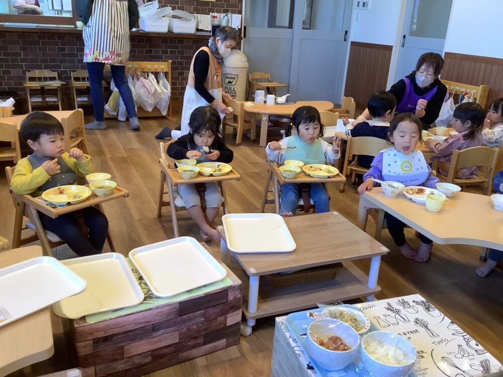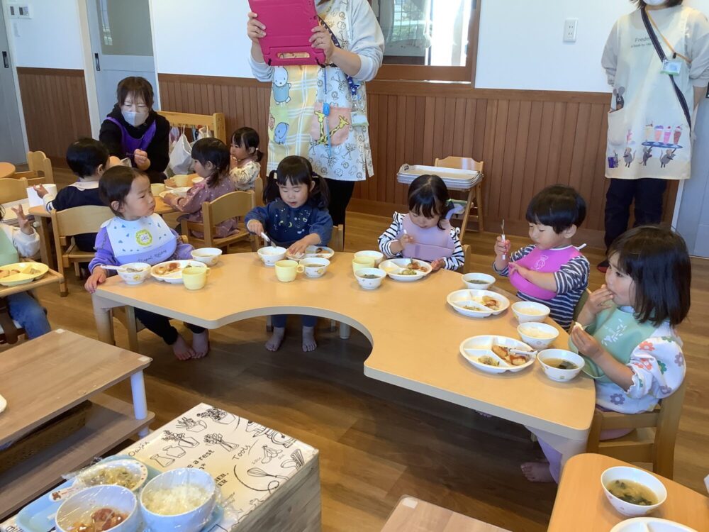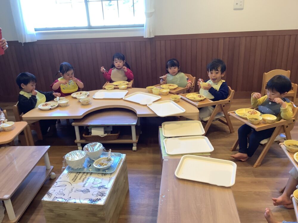 お店屋さんごっこやコーナー遊び、戸外遊びをたっぷり楽しんだ後は、みんなで円くなって給食を食べました。いつもと違う雰囲気に会話も弾み、楽しい給食の時間となりました。