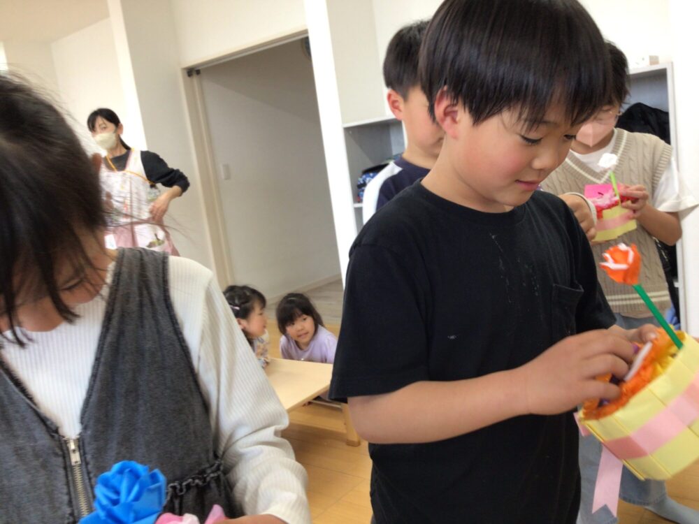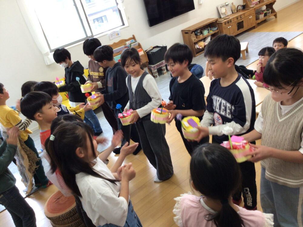 劇の後は、2年生から1年生と3年生にプレゼントを渡しました。1年生には手作りの折り紙を、3年生にはメッセージ付きのお花のプレゼントを渡しました。